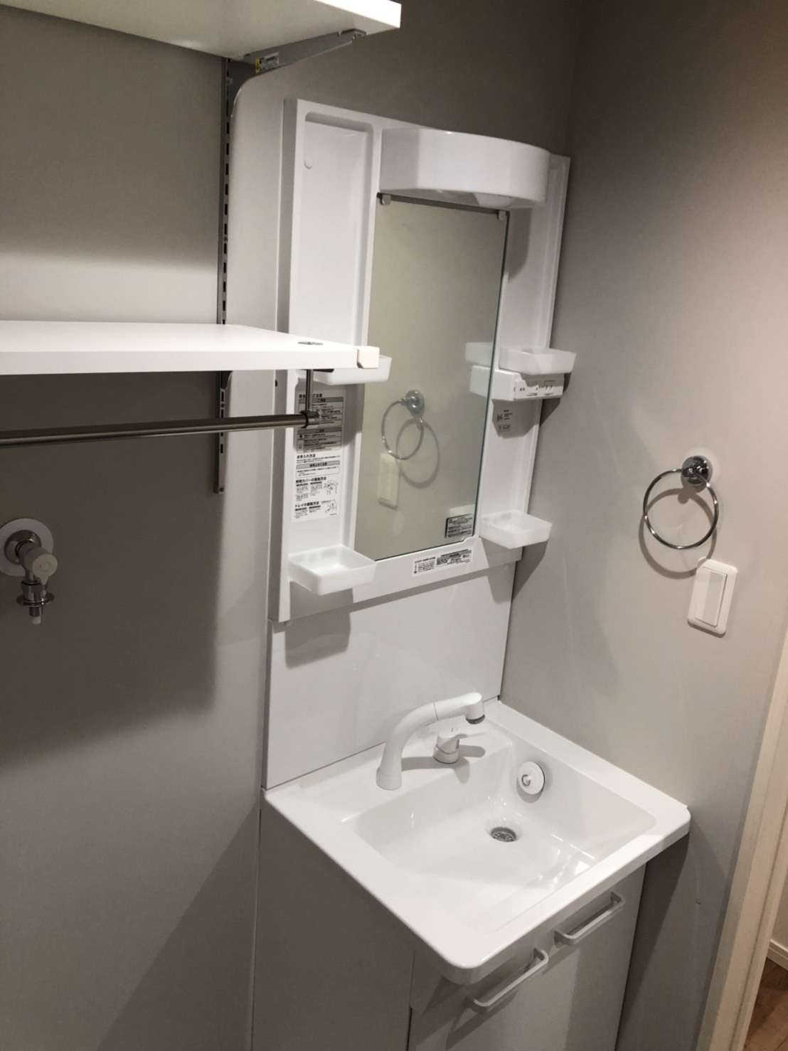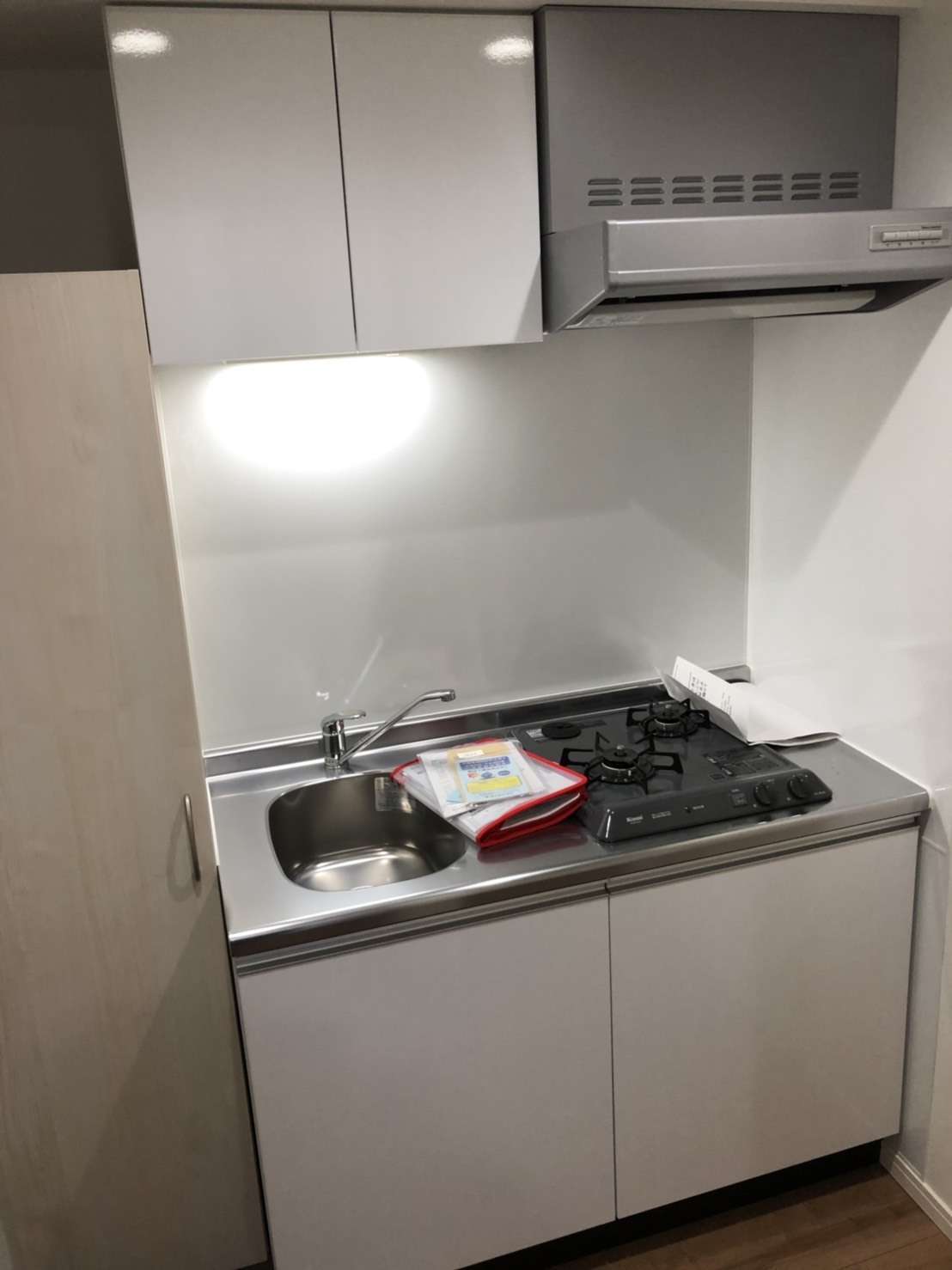 洗面台とキッチンスペースは明るい照明に仕上がっています。